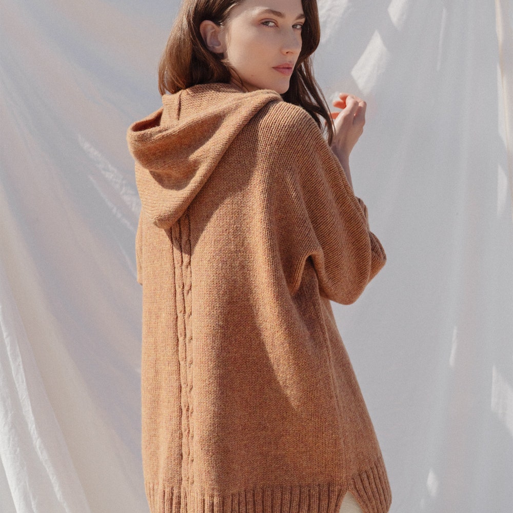 Oversized cacao woolen poncho with zipper closure and a hood is a perfect example of a mix of simplicity and comfort. Designed with a focus on textured knit ending, this sporty casual poncho is made from 100% soft merino wool.