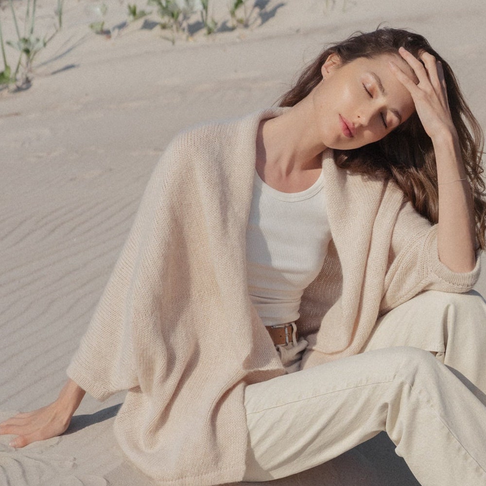 Elevate your ensemble with a handcrafted natural wool poncho cape, the epitome of comfort and coziness. This unbuttoned women’s top exudes a summer holiday vibe, offering the perfect shoulder cover. Expertly hand-knitted and longer than your typical poncho, it boasts the finest alpaca wool and pure new merino wool yarns for an exceptionally soft feel.